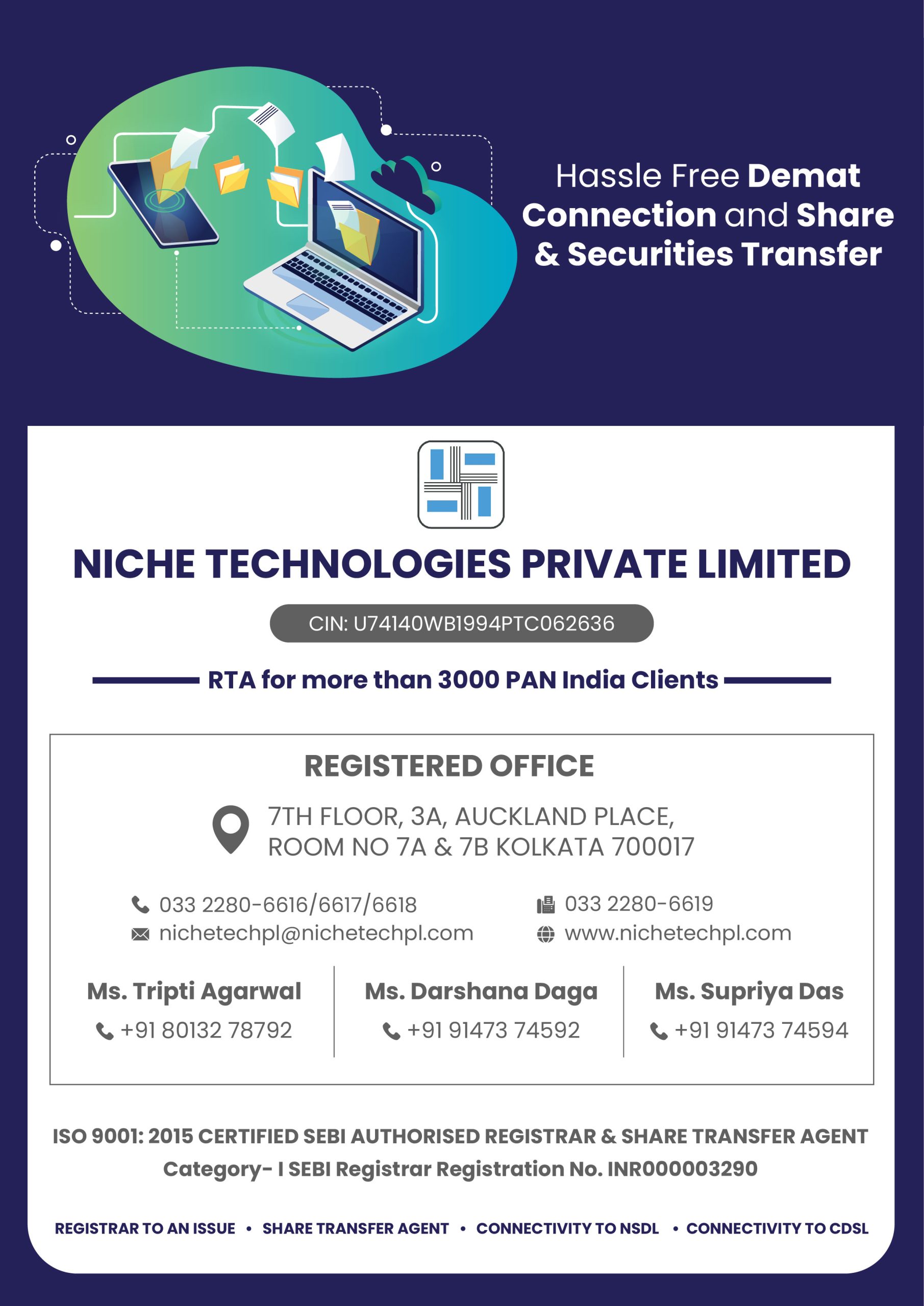 NICHE TECHNOLOGIES PVT. LTD. is a SEBI approved Category I Registrars to Issue and Share Transfer Agents. It is having all the modern infrastructure facilities to cater the needs of primary and secondary market related activities like Public Issue, Right Issue, Bonus Issue, Preferential Issue, Mergers, Takeovers and other related activities related to Shares & Securities Transfer job.